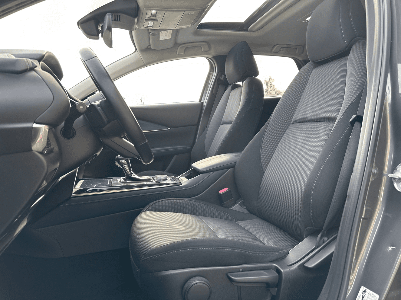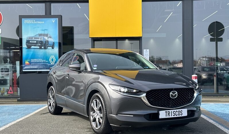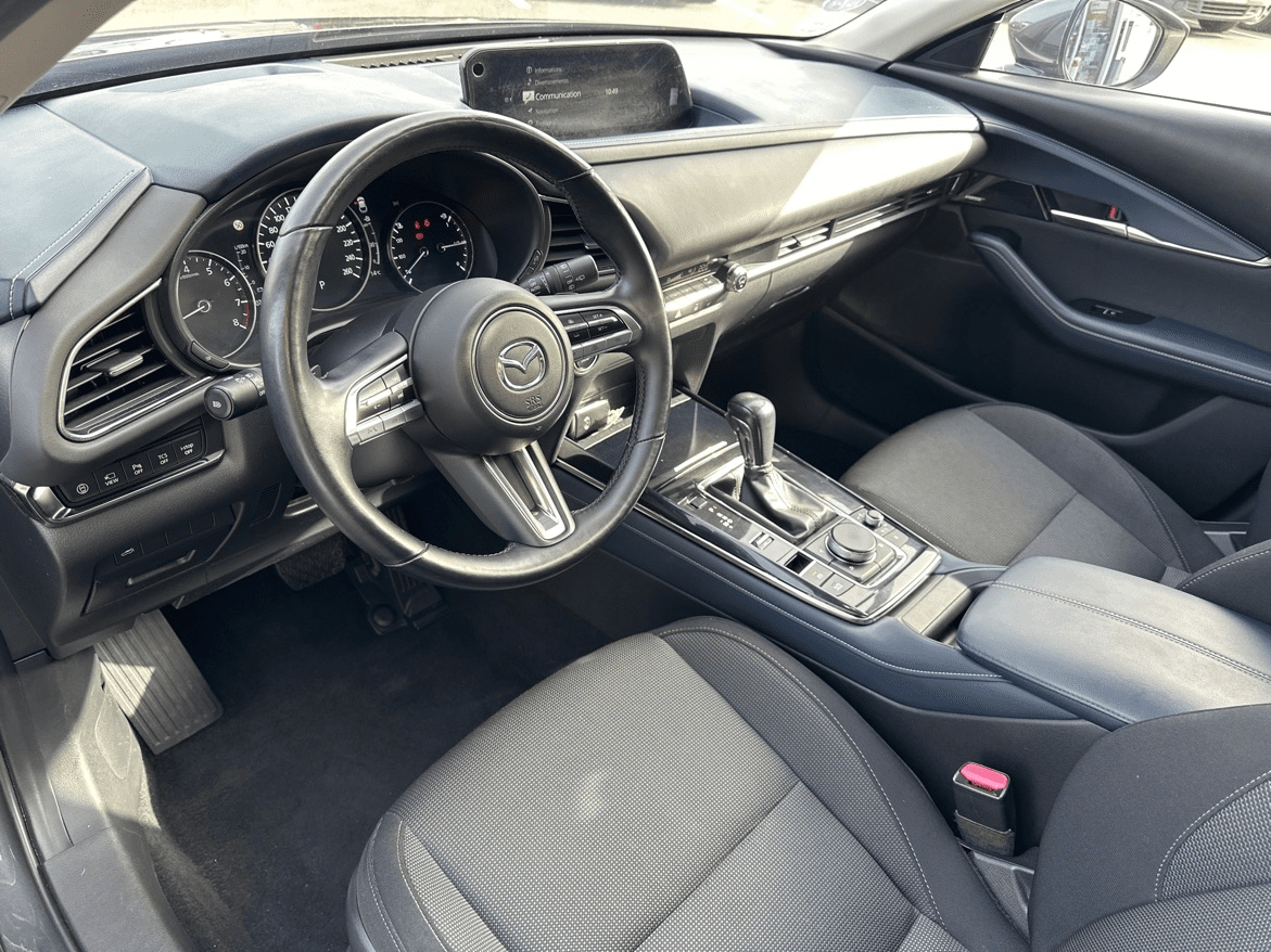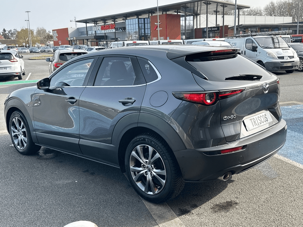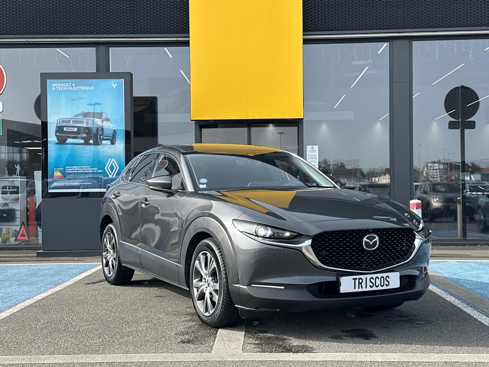MAZDA CX-30 2.0 SKYACTIV-X M-HYBRID 180CH SPORTLINE BVA - Toit ouvrant électrique - 12 Haut parleurs - ABS - Accoudoir central AV avec rangement - Affichage tête haute - Aide au démarrage en côte - Aide au freinage d'urgence - Airbag conducteur - Airbag genoux - Airbag passager - Airbags latéraux avant - Airbags rideaux AV et AR - Appel d'Urgence Localisé - Assistance de maintien de trajectoire - Banquette 60/40 - Becquet arrière - Boite à gants fermée - Buses de lave-glace chauffantes - Caméra de recul - Caméra vue panoramique 360° - Capteur de luminosité - Capteur de pluie - Clim automatique bi-zones - Coffre assisté électriquement - Commandes vocales - Contrôle de couple en courbe - Contrôle de freinage en courbe - Contrôle élect. de la pression des pneus - Démarrage sans clé - EBD - Eclairage d'ambiance - Ecran multifonction couleur - ESP - Feux arrière à LED - Filtre à Pollen - Follow me home - Fonction MP3 - Freinage automatique d'urgence - GPS Cartographique - Inserts de tableau de bord métal - Interface Media - Kit mains-libres Bluetooth - Limiteur de vitesse - Lunette arrière surteintée - Miroir de courtoisie conducteur éclairé - Miroir de courtoisie passager éclairé - Ordinateur de bord - Ouverture des vitres séquentielle - Palettes changement vitesses au volant - Phares antibrouillard - Phares avant LED - Pommeau de levier vitesse en cuir - Porte-gobelets avant - Prise 12V - Prise USB - Radar de stationnement AR - Radar de stationnement AV - Radio numérique DAB - Reconnaissance panneaux de signalisation - Régulateur de vitesse adaptatif - Répétiteurs de clignotant dans rétro ext - Rétroviseur intérieur électrochrome - Rétroviseurs dégivrants - Rétroviseurs électriques - Rétroviseurs extérieurs électrochromes - Rétroviseurs rabattables automatique - Services connectés - Siège conducteur avec réglage lombaire - Siège conducteur chauffant - Siège conducteur réglable en hauteur - Siège passager avec réglage lombaire - Siège passager chauffant - Siège passager réglable en hauteur - Système avancé de détection d'obstacles - Système d'accès sans clé - Système d'alerte de véhicule en approche - Système de contrôle des angles morts - Système de détection de somnolence - Système de prévention des collisions AR - Système de sécurité post-collisions - Système d'éclairage intelligent - Système Hi-Fi Surround - Tablette cache bagages - Tissu Noir - Verrouillage auto. des portes en roulant - Verrouillage centralisé à distance - Verrouillage centralisé des portes - Vitres arrière électriques - Vitres arrière surteintées - Vitres avant électriques - Volant chauffant - Volant cuir - Volant métal - Volant multifonction